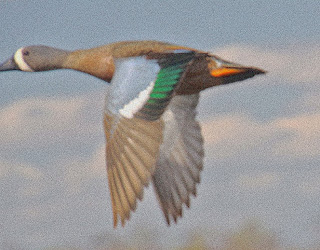 As this pair is flying away from me (like most ducks do when I hunting them), the teal- blue shoulder patches can be seen. Both males and females(right) have them. Lots of time, these guy are moving so fast that a flash of blue is all I'll see and then they are history , as in did I just see .... naw, must have been my imagination.