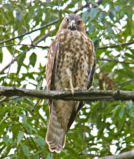 A young hawk use the yard as his training grounds.