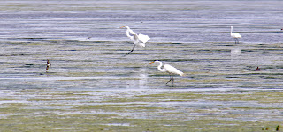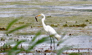 In the middle left of this photo a Purple Martin hunts for insects, while the Egret fish.