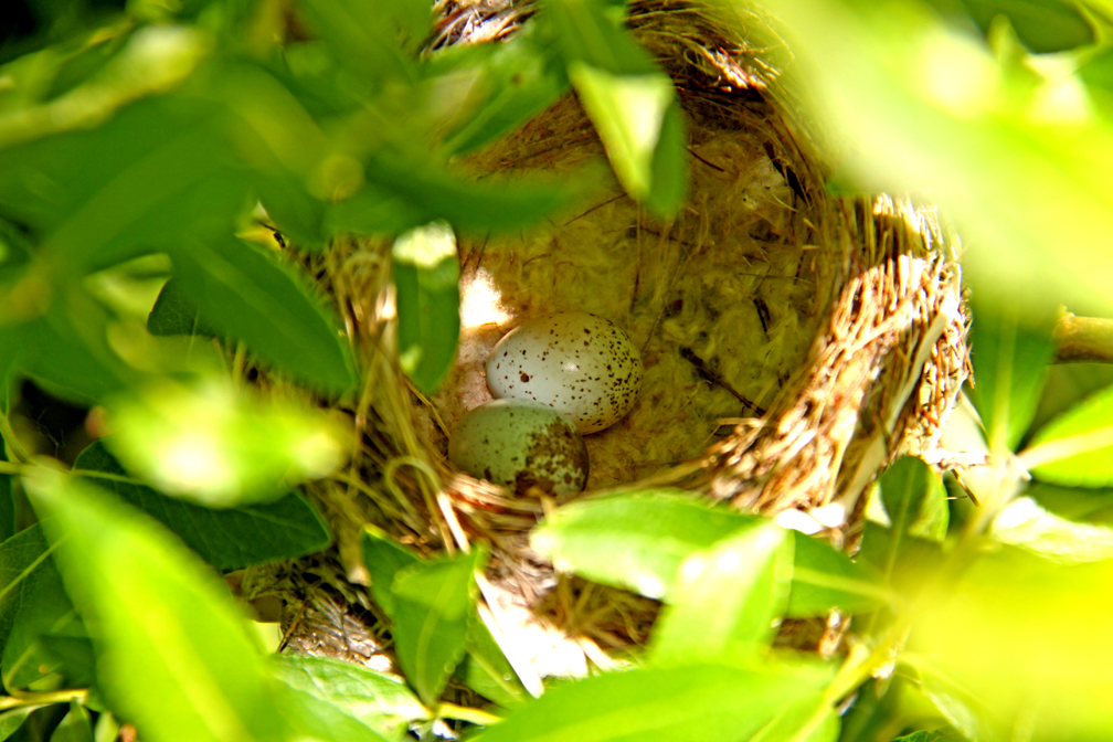 Nestled in a fork of the willow is the Goldfinch's nest. Made of spider's web, grass and feathers it holds two white and brown eggs.