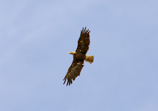 Earlier I noticed two large dark shapes in a dead tree some distance away. Wondered what it might be but no second thoughts. Later, one of the shapes took flight in my direction. I had stirred the interest of a Bald Eagle, it circled a few times.