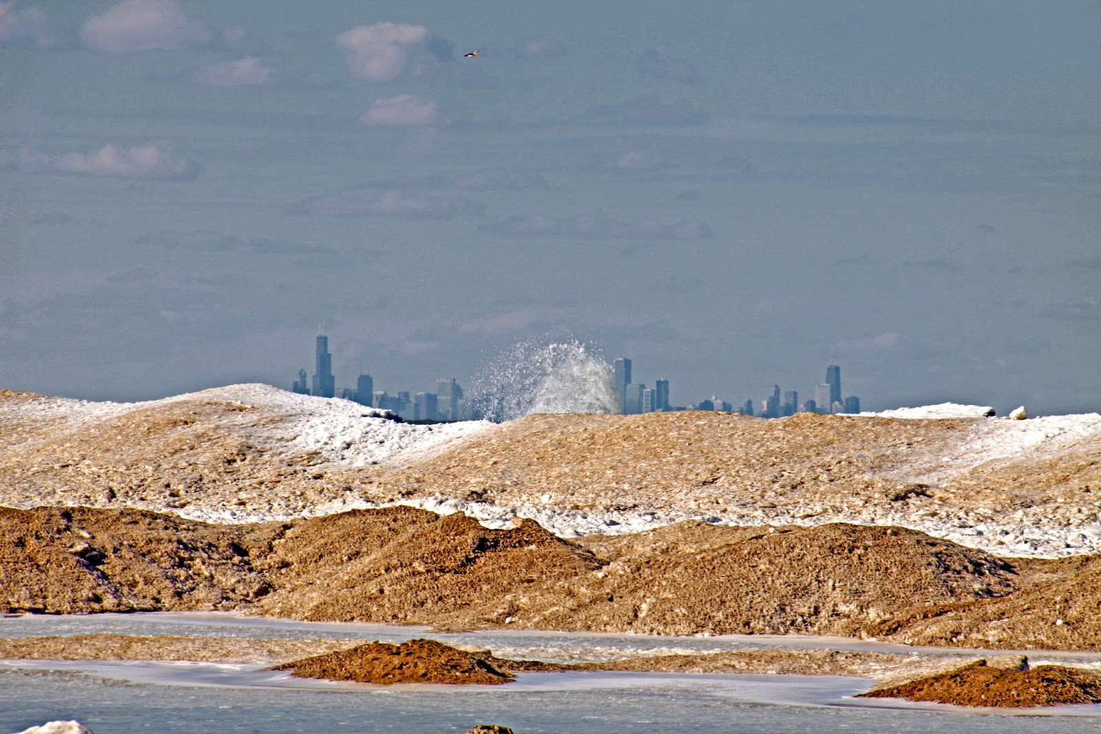 Looking in a northwesterly direction, you can see how the dunes are formed or the process of dune formation as it is happening. Okay, what do you see, besides "Chicago on Ice". The Winds makes waves that carry sand ashore and pile the sand in the form of dunes. In time some of the sand will be blown inshore to replenish the dune and some will wash back into the lake forming underwater sand bars that create the dangerous rip currents that claim too many lives each summer.